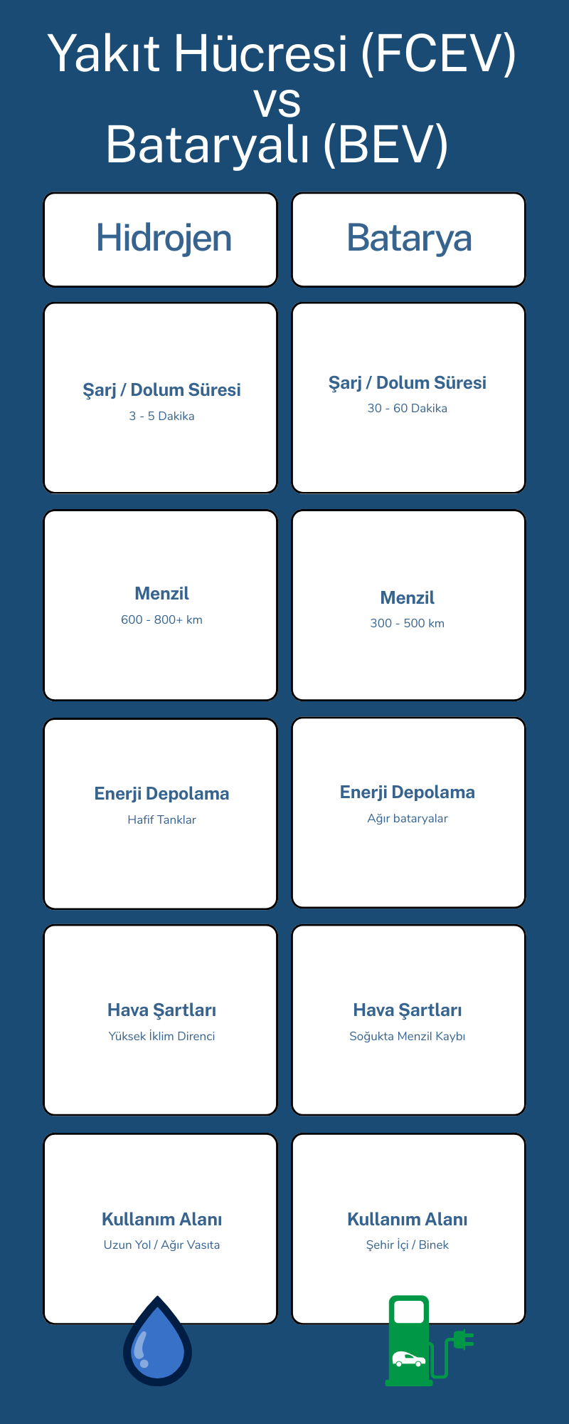Şehir içi bireysel kullanımda BEV liderliğini koruyacak gibi görünse de; uzun yolculuklarda, ağır taşımacılıkta, gemilerde ve otobüslerde FCEV tek gerçek çözüm olarak öne çıkıyor.